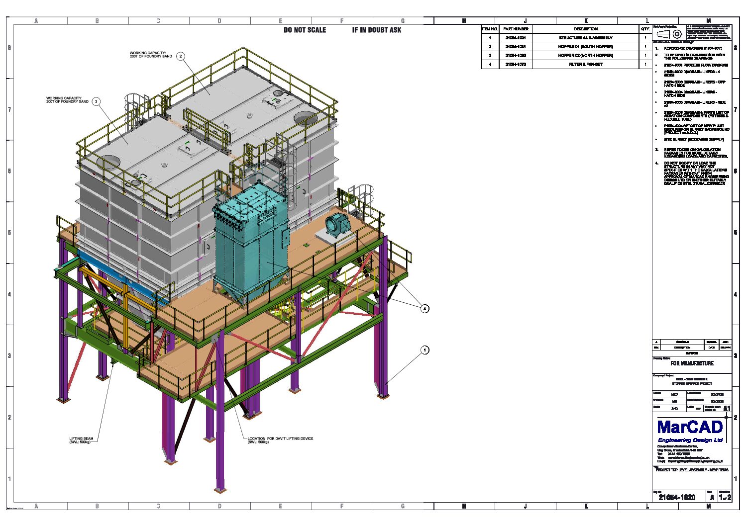 A full turnkey package, the supply, fabrication, surface treatment and erections of a pair of 32 tonnes foundry sand moulding hoppers. This also includes the 40 tonnes of associated steel work.