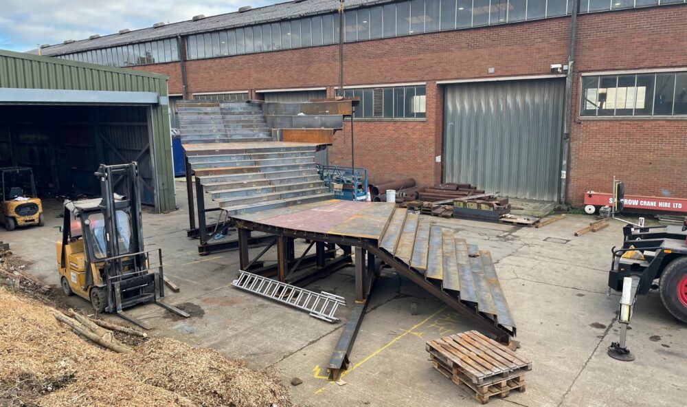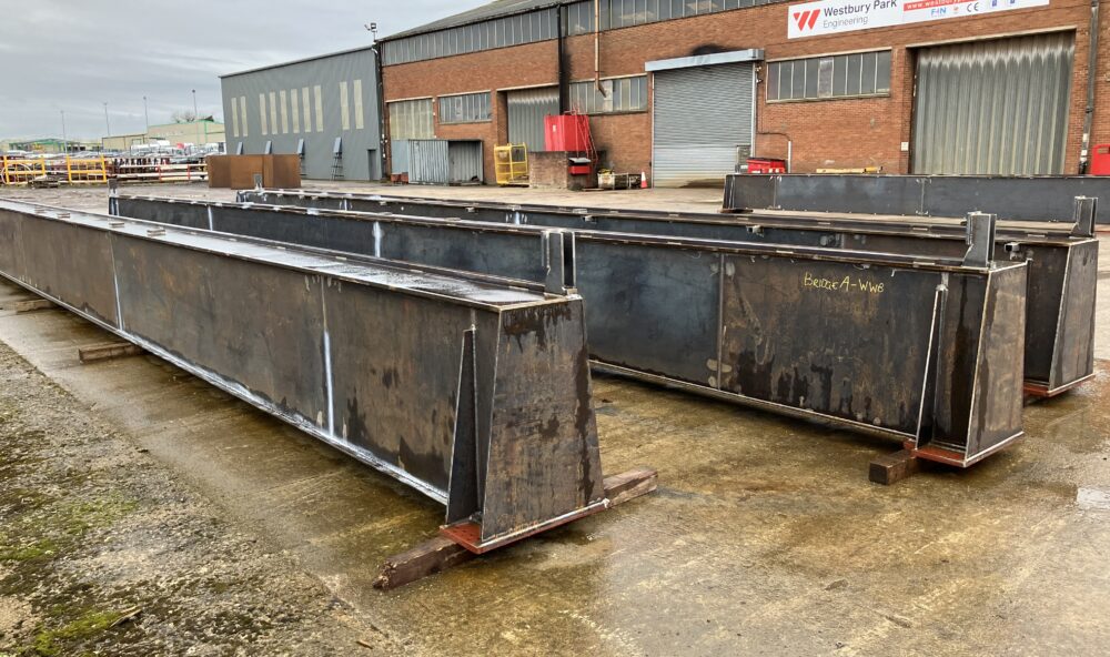 Full crane structure for an aircraft installation warehouse. This included 10 number trestle support legs, 8 number 8.0m rail beams and 2 number 6.3t girder beams